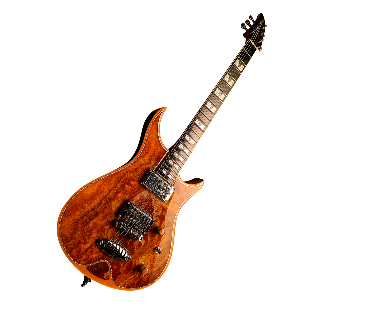 Gorgonized Morpheus #OF001 “George” – Stone, Sound & SoulDie erste neue Morpheus seit über einem Jahr – und zugleich die erste überhaupt mit Set-Neck-Konstruktion. Mehr Resonanz, mehr Sustain, ein noch flüssigeres Spielgefühl.Die Decke? Kein Druck, kein Furnier, kein „Stein-Look“ – sondern echter Stein: eine 5 mm starke Platte aus gebändertem Calcit („Onyx Fantastico Red Light“), entstanden über Millionen von Jahren. Veredelt im Orange-Burst-Finish mit chromfarbenem Hologramm-Pinstripe.Der kammergefräste Korpus aus Linde hält das Gewicht angenehm niedrig, während der Stein für glasklare Ansprache und Sustain sorgt. Eine Glasfaserverstärkung macht die Decke schlagfest und bühnentauglich.Der dreiteilige Ahornhals aus kanadischem Ahorn (mit Mahagoni-Streifen) bietet Stabilität und ist mit einem Ebonol-Griffbrett im 12"-Radius ausgestattet – für geschmeidiges Spiel und brillanten Ton.Die Elektronik liefert maximale Vielseitigkeit: Kammerstein Z2 Humbucker mit Coil-Split für Singlecoil-Sounds. Dazu Wilkinson Roller Bridge, Custom Lite-Speed Tailpiece, Locking Mechaniken und GraphTech-Sattel für absolute Stimmstabilität. Sogar die Reglerknöpfe sind mit Calcit-Intarsien versehen – passend zur Decke.Mit nur 3,6 kg Gewicht, im Luxus-Hartschalenkoffer und mit Zertifikat. Getauft auf den Namen „George“ zu Ehren eines guten Freundes, der die Gorgonized-Serie inspiriert hat.Technische DatenModell: Gorgonized Morpheus #OF001 “George”Korpus: Kammergefräste Linde mit 5 mm Calcit-Decke (Onyx Fantastico Red Light)Finish: Orange Burst mit chromfarbenem Hologramm-PinstripeDeckenrückseite: GlasfaserverstärktHals: 3-teilig kanadischer Ahorn mit Mahagoni-Streifen (Set-Neck)Mensur: 25,5" (648 mm)Halsprofil: Modern CGriffbrett: Ebonol, 12" RadiusBünde: 22 Medium JumboSattelbreite: 43 mm (GraphTech)Tonabnehmer: Kammerstein Z2 Humbucker (Coil-Split)Schaltung: 3-Wege-Toggle, Master Volume, Master Tone (Push/Pull für Coil-Split)Bridge: Wilkinson Roller BridgeTailpiece: Custom Lite-Speed TailpieceMechaniken: Locking TunersHardware: ChromGewicht: 3,6 kgKoffer: Luxus-Hartschalenkoffer inklusiveExtras: Calcit-Inlays in den Reglerknöpfen, ZertifikatPreis: 4500 Euro inklusive 19% MwSt.