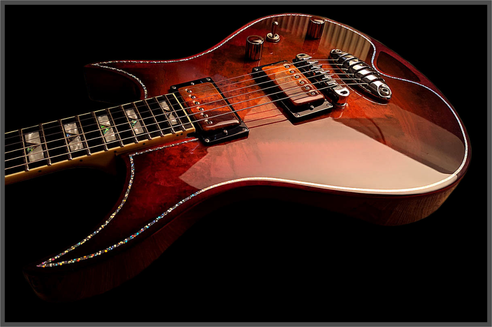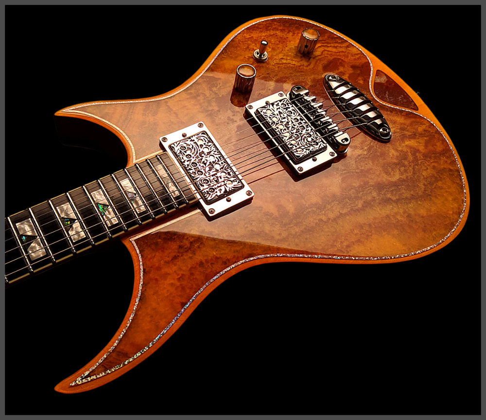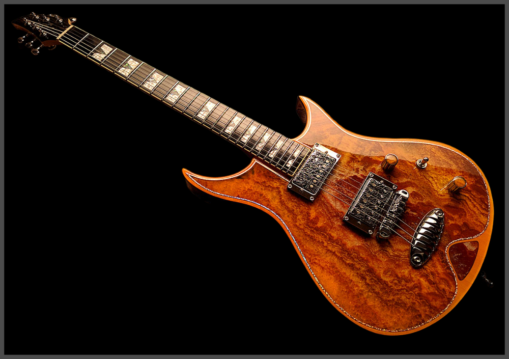 Zerberus Guitars – Gorgonized Morpheus #OF009(Burnt-Cinnamon-Burst)Diese Morpheus trägt keine Fototapete, keine Keramik-Imitation und auch kein hauchdünnes Steinfurnier.Hier bekommst du eine vollmassive 5 mm Decke aus echtem, gebändertem Calcit („Onyx Fantastico Red Light“) – ein Halbedelstein, von Hand ausgesucht wegen seiner spektakulären Kristallstruktur und einzigartigen Maserung.Die Rückseite der Decke ist mit Glasfaser verstärkt. So bleibt sie bruchsicher, auch wenn es auf der Bühne mal wilder zugeht. Das Blue-Burst Finish lässt die Kristalle je nach Lichteinfall schimmern und macht aus jeder Bewegung ein neues Bild.Für den Sound sorgt ein klassisches Seymour Duncan Set:SH-1N ’59 am Hals für warme Vintage-Clean-Sounds und SH-4 JB an der Brücke für kraftvollen Biss und singendes Sustain.Die Pickup-Kappen sind handbemalt, damit sich das Steinmuster optisch ohne Unterbrechung fortsetzt.Technische DatenKorpus: Kammerbauweise aus Linde mit 5 mm massiver Halbedelstein-Decke (Onyx Fantastico Red Light – echter Calcit, kein Furnier, keine Imitation), rückseitig glasfaserverstärktFinish: Burnt-Cinnamon-BurstHals: Set-Neck, kanadischer Ahorn mit Mahagoni-StreifenMensur: 648 mm (25,5")Griffbrett: Ebonol, 14" RadiusBünde: 24 MediumSattel: GraphTech, 43 mmBrücke: Wilkinson Roller BridgeTailpiece: Zerberus Lite-Speed (gefrästes, verchromtes Aluminium)Mechaniken: Locking TunerPickups: Seymour Duncan SH-1N ’59 (Neck), SH-4 JB (Bridge)Schaltung: 3-Wege-Toggle, Master Volume, Master ToneGewicht: ca. 3,6 kgCase: maßgefertigtes Luxus-CaseZubehör: EchtheitszertifikatPreis: 4500 Euro inklusive 19% MwSt.