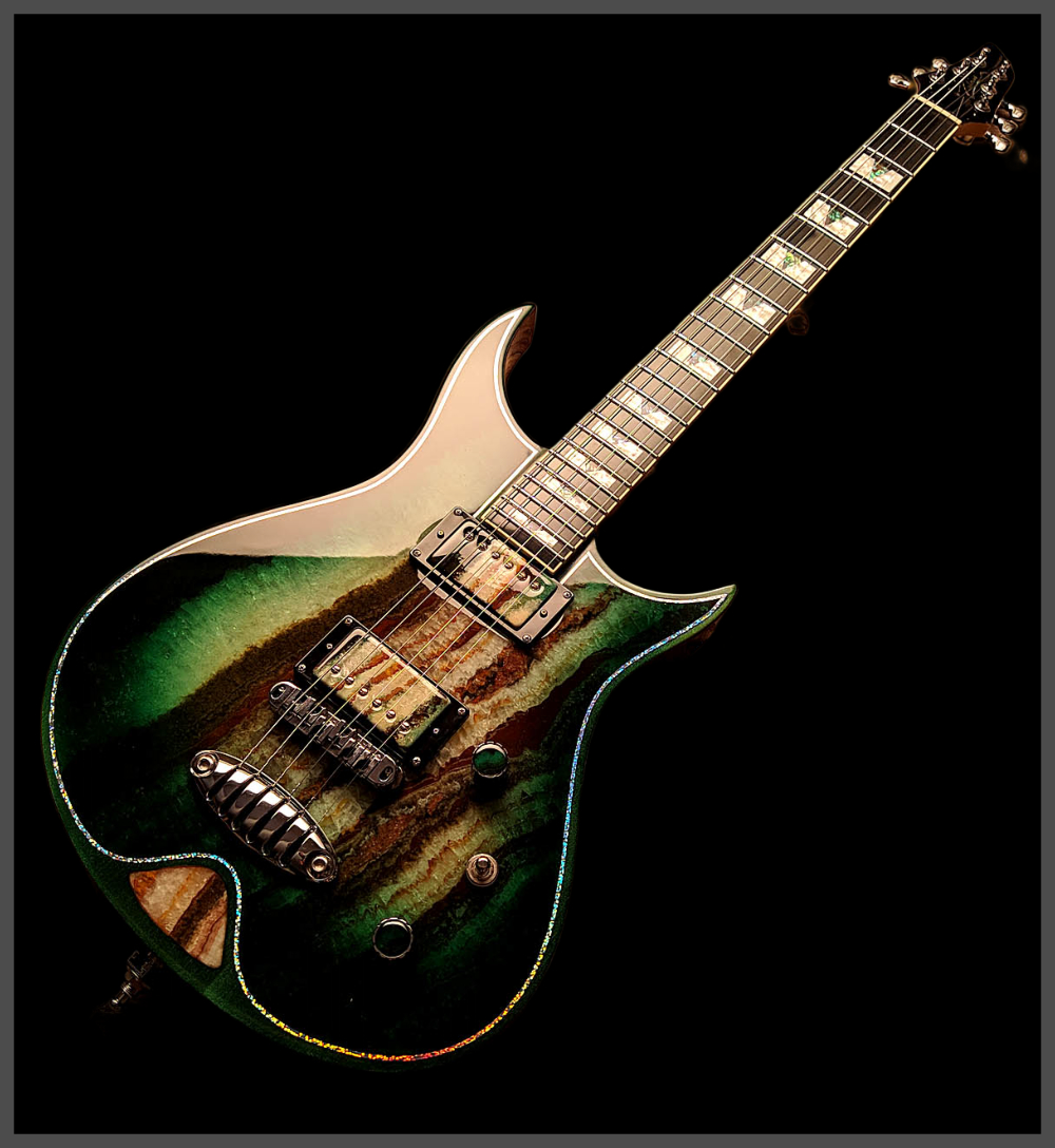 Video demo of the Zerberus Morpheus OF001 custom electric guitar featuring an Onyx Fantastico stone top.