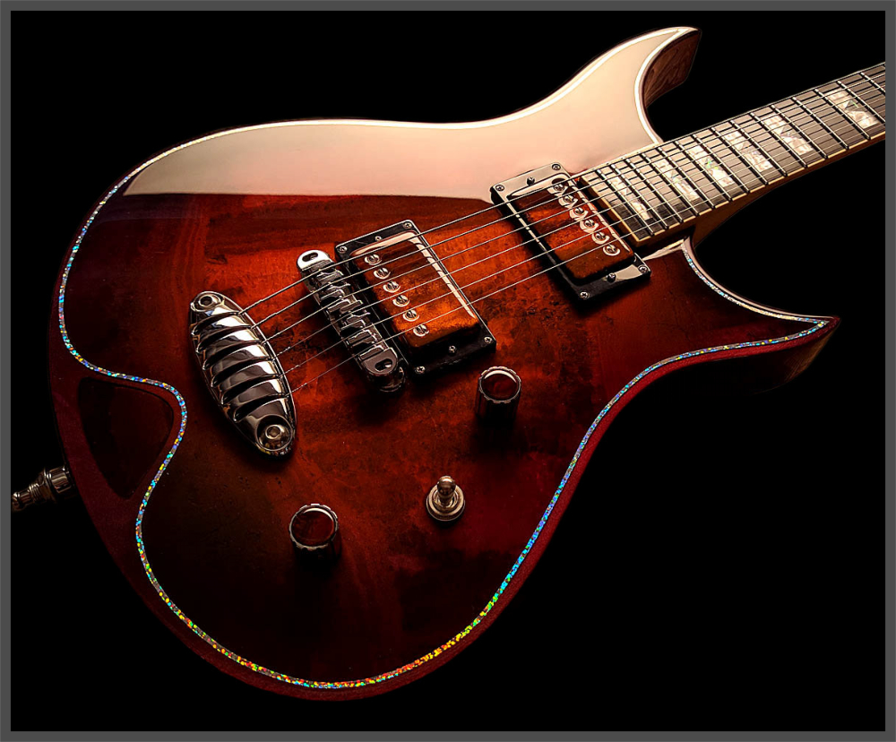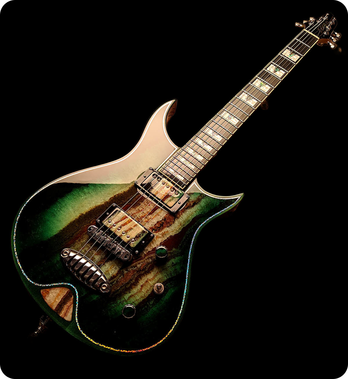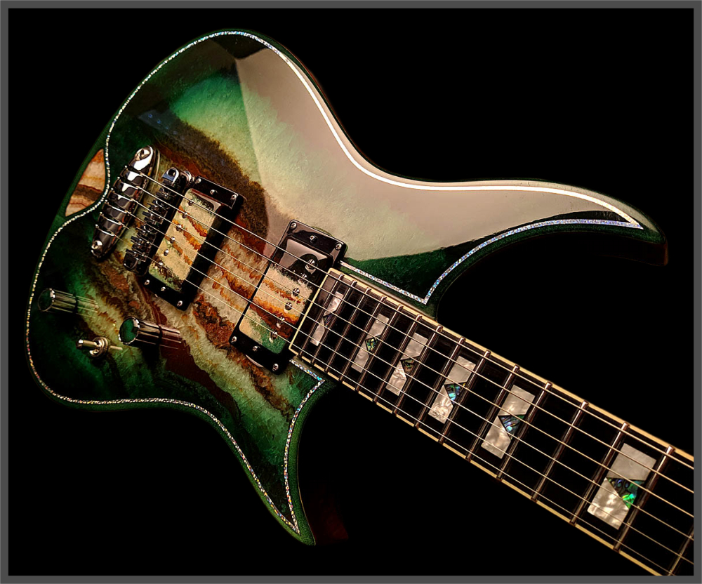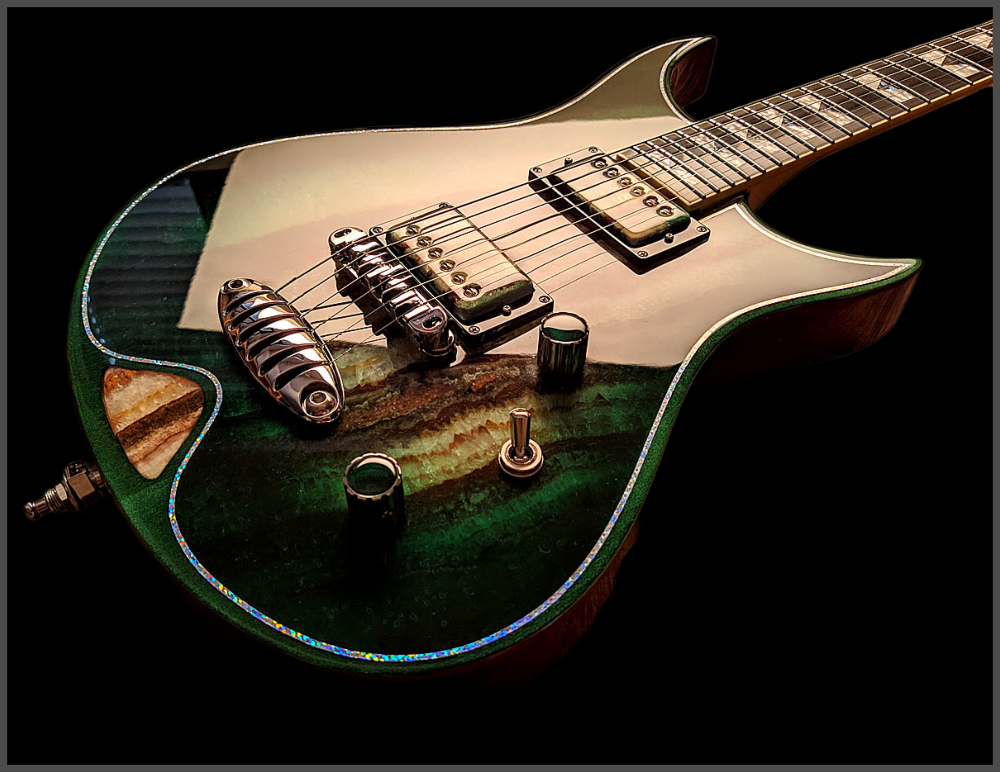 Video demo of the Zerberus Morpheus OF001 custom electric guitar featuring an Onyx Fantastico stone top.