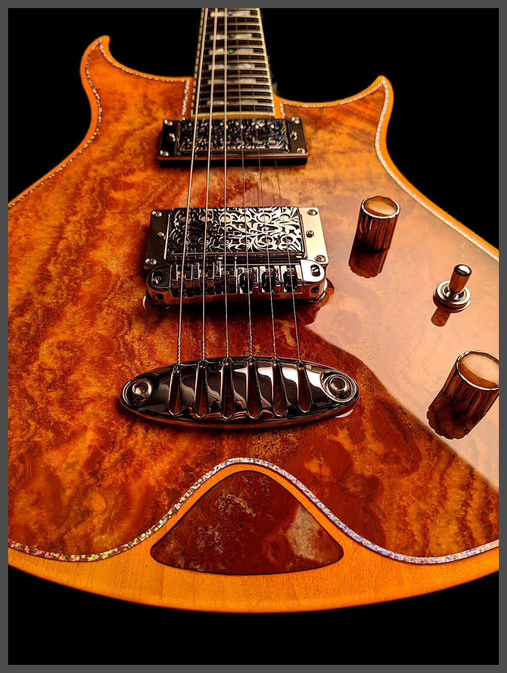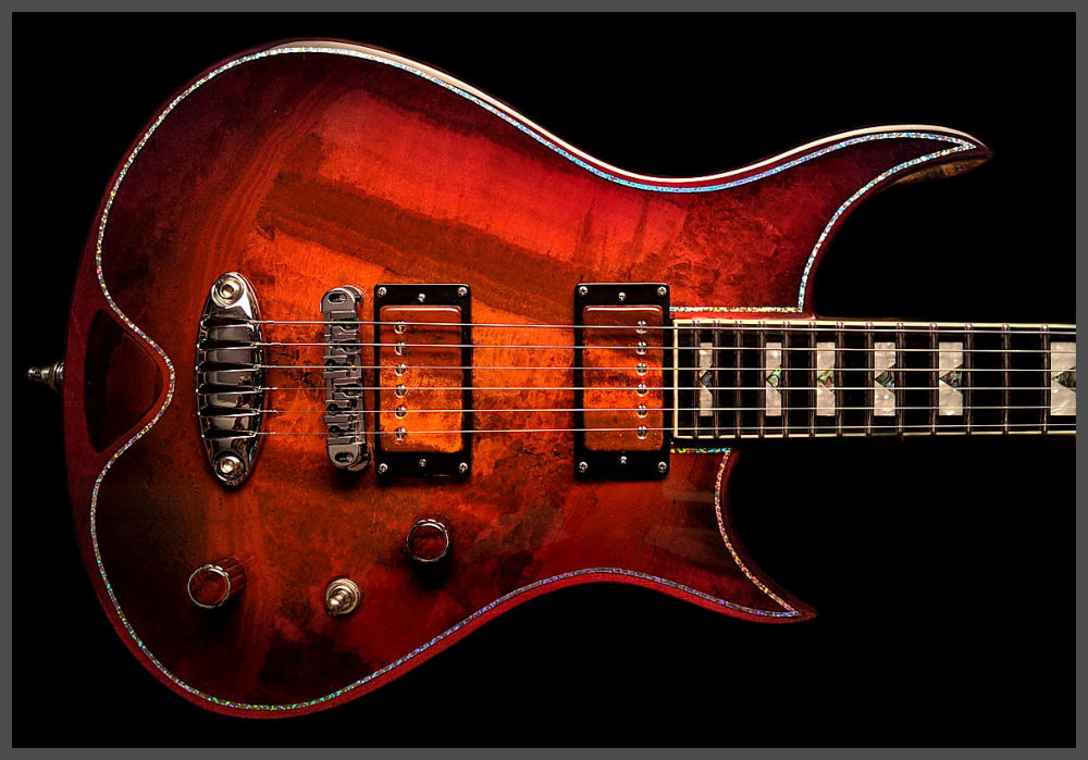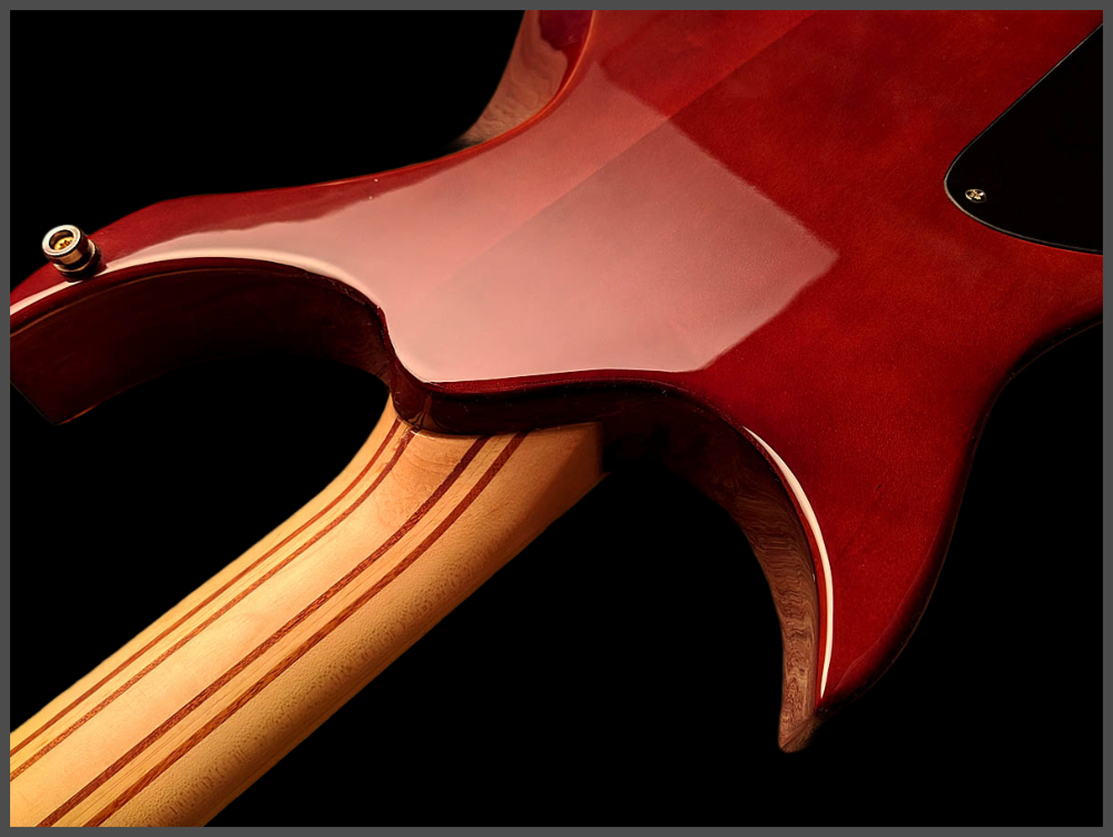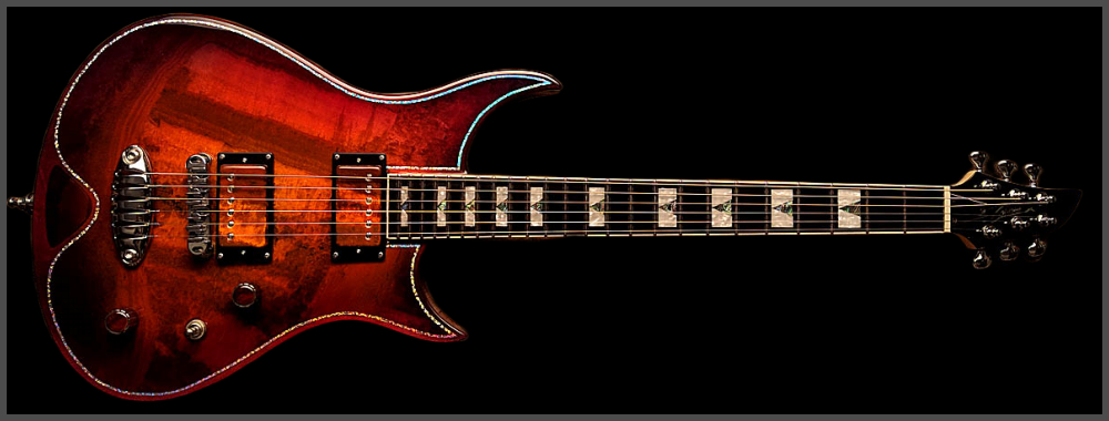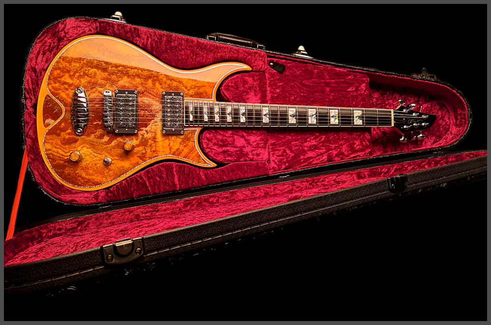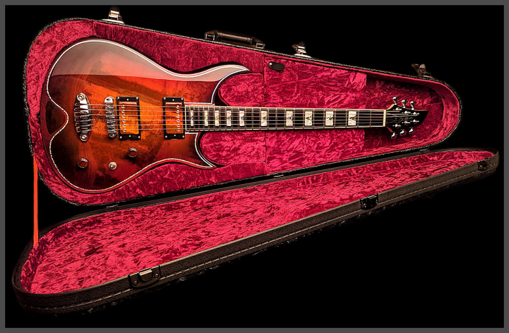 Zerberus Guitars – Gorgonized Morpheus #OF009(Burnt-Cinnamon-Burst)Diese Morpheus trägt keine Fototapete, keine Keramik-Imitation und auch kein hauchdünnes Steinfurnier.Hier bekommst du eine vollmassive 5 mm Decke aus echtem, gebändertem Calcit („Onyx Fantastico Red Light“) – ein Halbedelstein, von Hand ausgesucht wegen seiner spektakulären Kristallstruktur und einzigartigen Maserung.Die Rückseite der Decke ist mit Glasfaser verstärkt. So bleibt sie bruchsicher, auch wenn es auf der Bühne mal wilder zugeht. Das Blue-Burst Finish lässt die Kristalle je nach Lichteinfall schimmern und macht aus jeder Bewegung ein neues Bild.Für den Sound sorgt ein klassisches Seymour Duncan Set:SH-1N ’59 am Hals für warme Vintage-Clean-Sounds und SH-4 JB an der Brücke für kraftvollen Biss und singendes Sustain.Die Pickup-Kappen sind handbemalt, damit sich das Steinmuster optisch ohne Unterbrechung fortsetzt.Technische DatenKorpus: Kammerbauweise aus Linde mit 5 mm massiver Halbedelstein-Decke (Onyx Fantastico Red Light – echter Calcit, kein Furnier, keine Imitation), rückseitig glasfaserverstärktFinish: Burnt-Cinnamon-BurstHals: Set-Neck, kanadischer Ahorn mit Mahagoni-StreifenMensur: 648 mm (25,5")Griffbrett: Ebonol, 14" RadiusBünde: 24 MediumSattel: GraphTech, 43 mmBrücke: Wilkinson Roller BridgeTailpiece: Zerberus Lite-Speed (gefrästes, verchromtes Aluminium)Mechaniken: Locking TunerPickups: Seymour Duncan SH-1N ’59 (Neck), SH-4 JB (Bridge)Schaltung: 3-Wege-Toggle, Master Volume, Master ToneGewicht: ca. 3,6 kgCase: maßgefertigtes Luxus-CaseZubehör: EchtheitszertifikatPreis: 4500 Euro inklusive 19% MwSt.