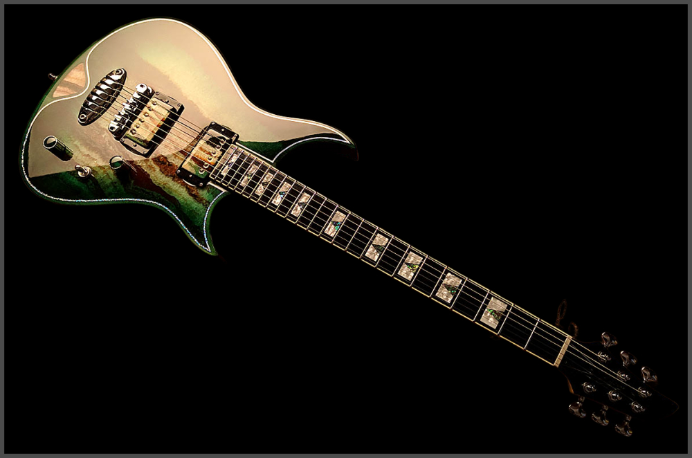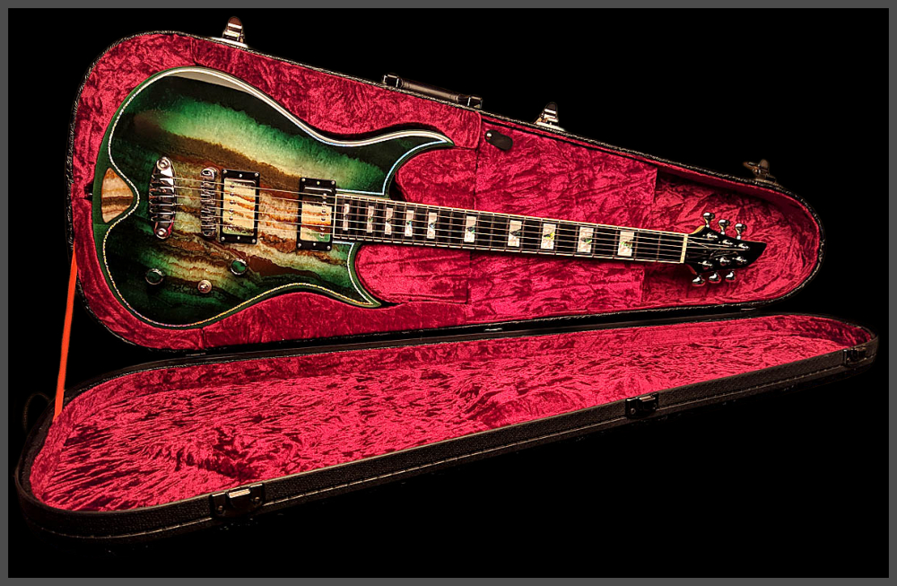 Zerberus Guitars – Gorgonized Morpheus #OF010 (Green-Burst)Es gibt „Stone Tops“… und es gibt Zerberus Stone Tops.Diese Morpheus trägt keine Fototapete, keine Keramik-Imitation und auch kein hauchdünnes Steinfurnier.Hier bekommst du eine vollmassive 5 mm Decke aus echtem, gebändertem Calcit („Onyx Fantastico Red Light“) – ein Halbedelstein, von Hand ausgesucht wegen seiner spektakulären Kristallstruktur und einzigartigen Maserung.Die Rückseite der Decke ist mit Glasfaser verstärkt. So bleibt sie bruchsicher, auch wenn es auf der Bühne mal wilder zugeht – und trotzdem fühlst du unter den Fingern die echte Steinoberfläche. Das Green-Burst Finish lässt die Kristalle je nach Lichteinfall schimmern und macht aus jeder Bewegung ein neues Bild.Für den Sound sorgt ein klassisches Seymour Duncan Set:SH-1N ’59 am Hals für warme Vintage-Clean-Sounds und SH-4 JB an der Brücke für kraftvollen Biss und singendes Sustain.Die Pickup-Kappen sind handbemalt, damit sich das Steinmuster optisch ohne Unterbrechung fortsetzt.Technische DatenKorpus: Kammerbauweise aus Linde mit 5 mm massiver Halbedelstein-Decke (Onyx Fantastico Red Light – echter Calcit, kein Furnier, keine Imitation), rückseitig glasfaserverstärktFinish: Green-Burst mit Chrom-Hologramm-PinstripeHals: Set-Neck, kanadischer Ahorn mit Mahagoni-StreifenMensur: 648 mm (25,5")Griffbrett: Ebonol, 14" RadiusBünde: 24 MediumSattel: GraphTech, 43 mmBrücke: Wilkinson Roller BridgeTailpiece: Zerberus Lite-Speed (gefrästes, verchromtes Aluminium)Mechaniken: Locking TunerPickups: Seymour Duncan SH-1N ’59 (Neck), SH-4 JB (Bridge)Schaltung: 3-Wege-Toggle, Master Volume, Master ToneGewicht: ca. 3,6 kgCase: maßgefertigtes Luxus-CaseZubehör: EchtheitszertifikatPreis: 4500 Euro inklusive 19% MwSt.